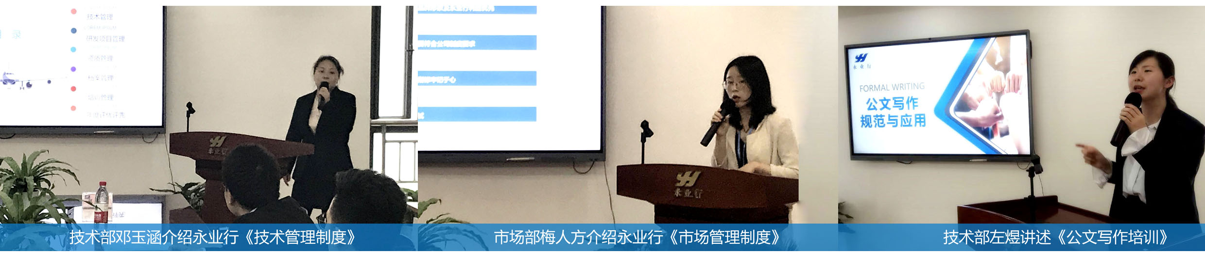 公司职能部门分别就《技术管理制度》《市场管理制度》《公文写作》向新员工进行培训。