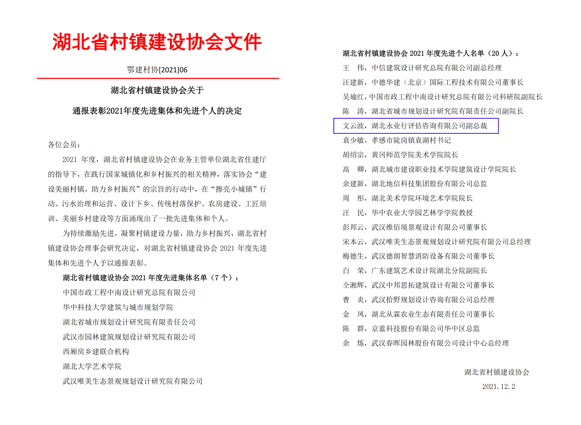永业行文云波获评湖北省村镇建设协会2021年度先进个人