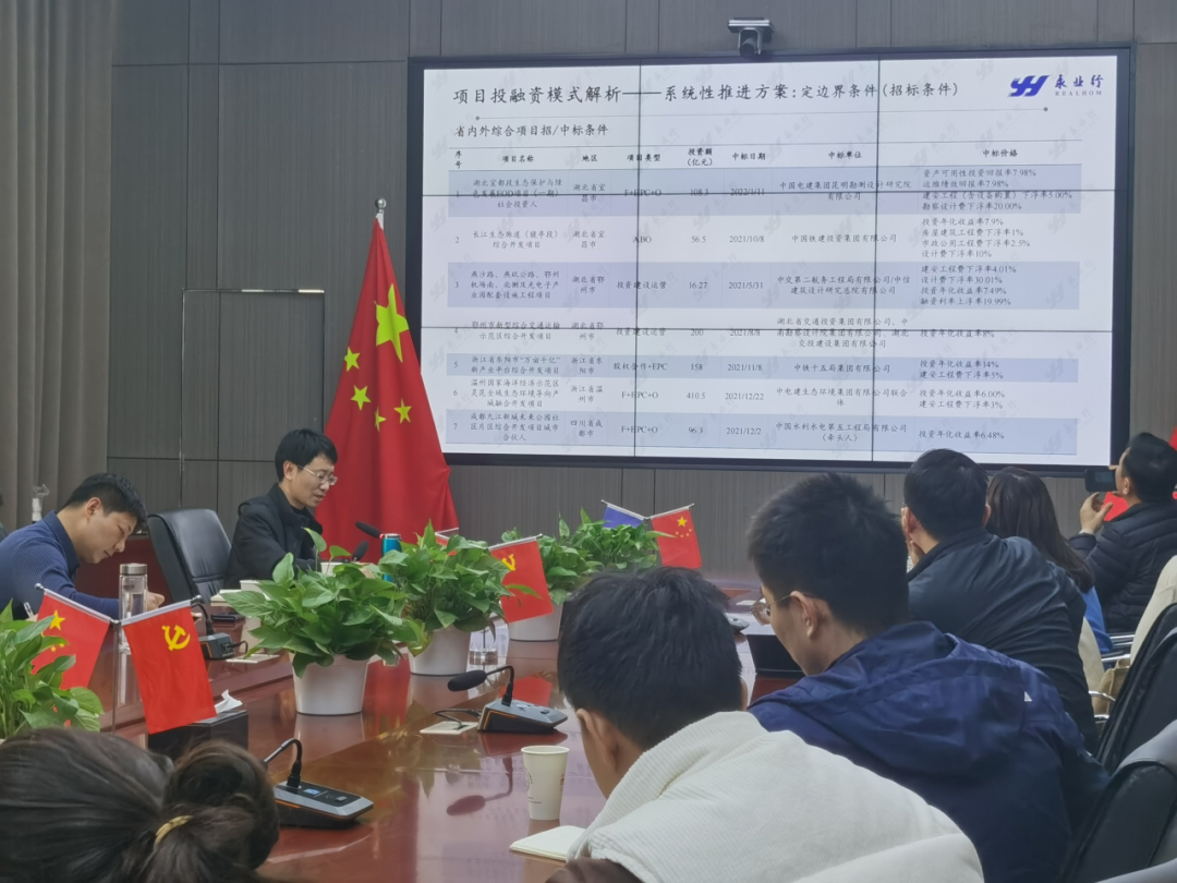 武汉生态设计院总工程师孙聪、武汉市政经营公司阎晓丹、市政机施公司市场营销中心经理王强、市政机施公司一分公司、五分公司、市场部领导及骨干员工,永业行投资金融产业链团队成员等参加本次会议。