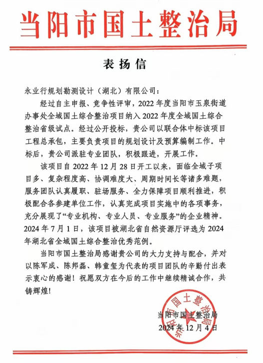 近期,永业行陆续收到了当阳市国土整治局、阳新县土地整理中心、黄石锦湖生态旅游发展有限公司等多封表扬信。信中充分肯定了我司“专业机构、专业人员、专业服务”的企业精神,表达持续精诚合作的美好意愿,并给予我司事业蓬勃发展,再创佳绩的良好祝愿。