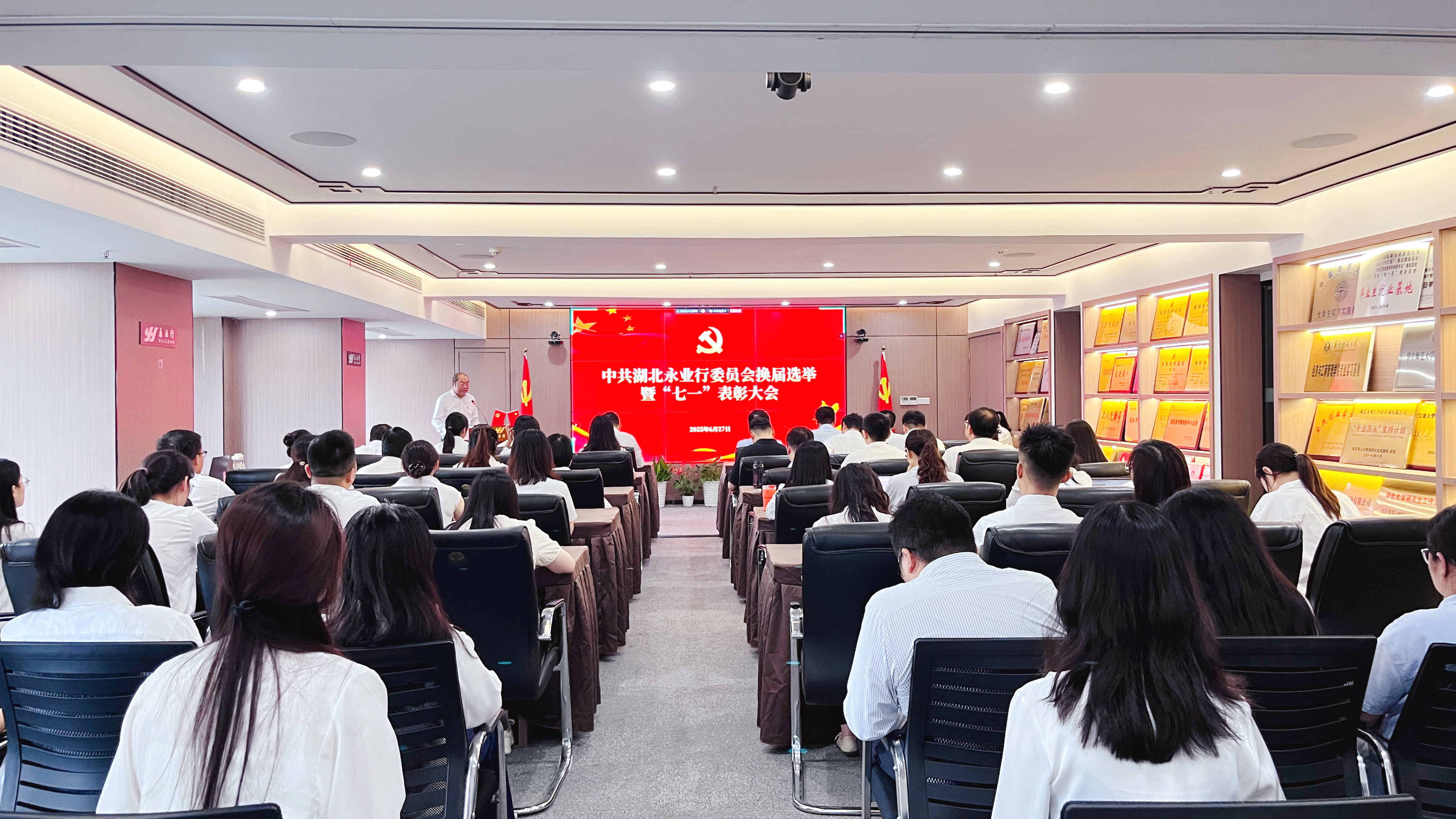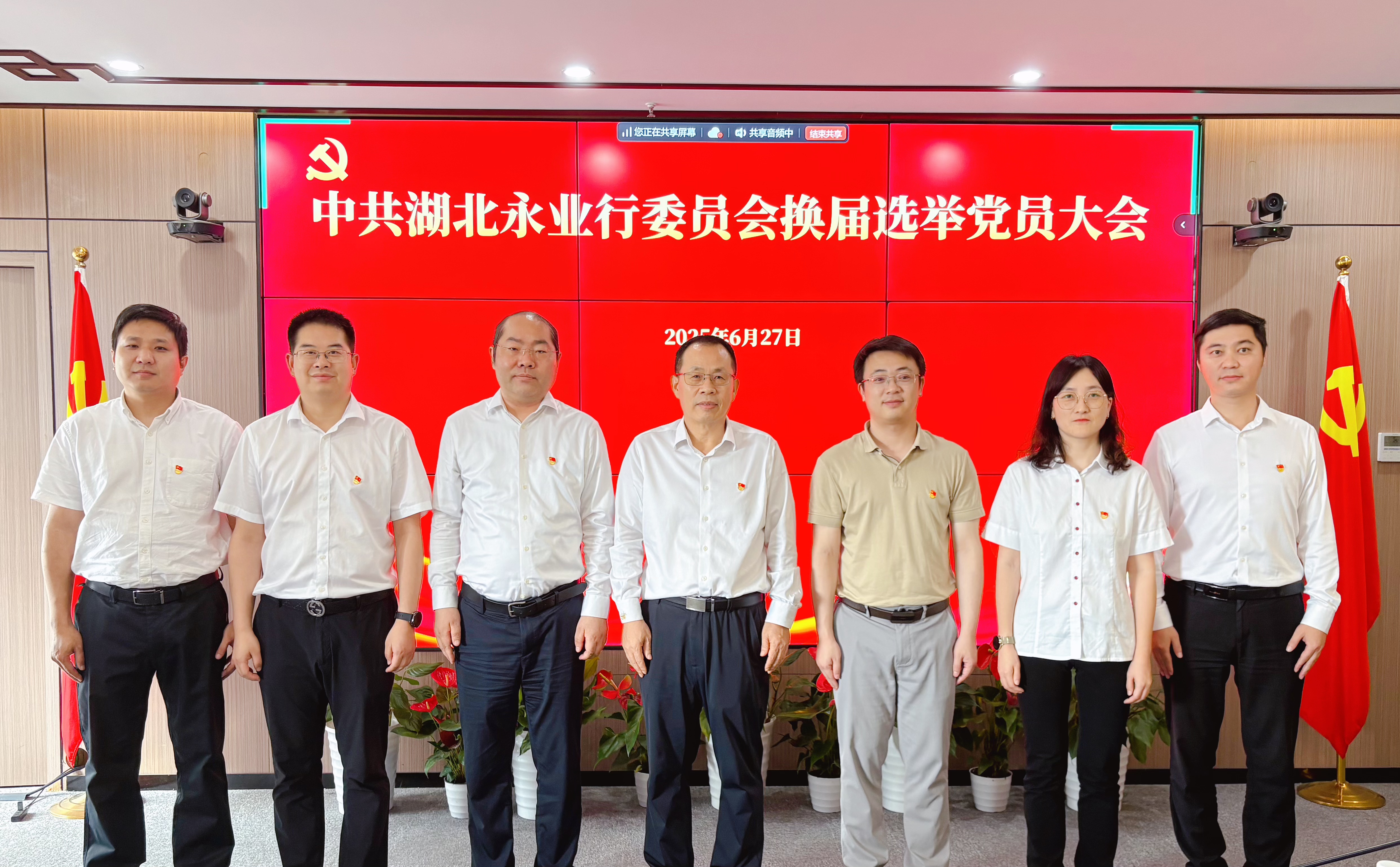 2025年6月27日,中共湖北永业行委员会召开党委换届选举暨“七一”表彰大会。武昌区委统战部常务副部长陆峰,武昌区委统战部副部长、区工商联党组书记、会员企业党委书记吕志新到会指导,永业行全体党员共计200余名通过线上线下相结合的形式参加会议。会议由永业行党委委员、常务副总裁吴学锋主持。